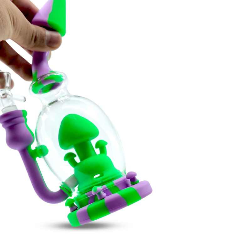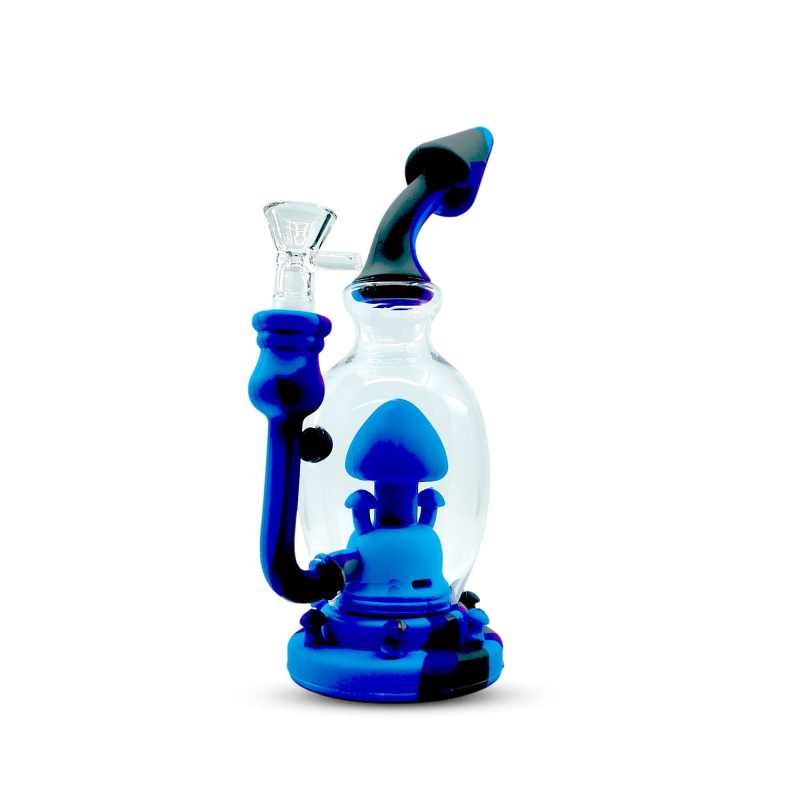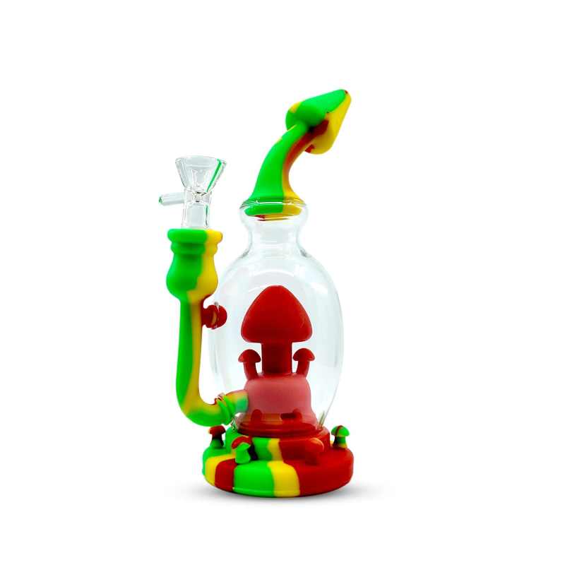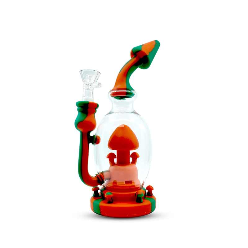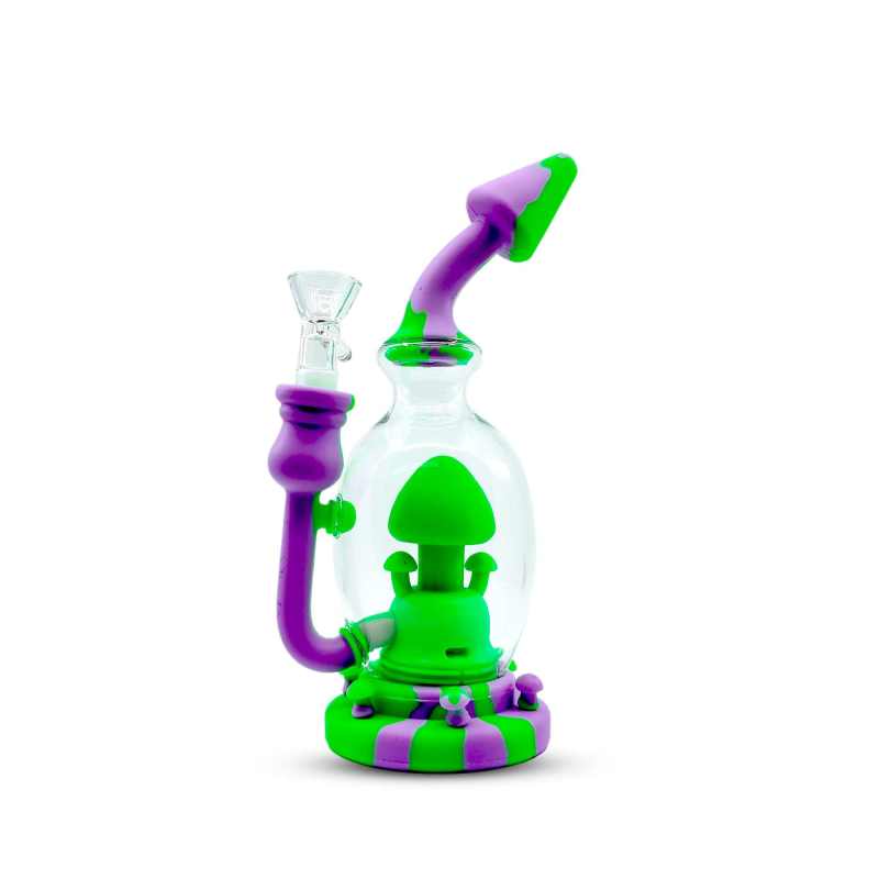 Add a splash of color and creativity to your sessions with the 8-inch Silicone Mushroom Dab Rig. Featuring a durable hybrid design of glass and silicone, this rig combines functionality with a playful mushroom-themed centerpiece inside the chamber. The detachable silicone parts make cleaning simple while the thick glass chamber ensures smooth filtration for every hit.